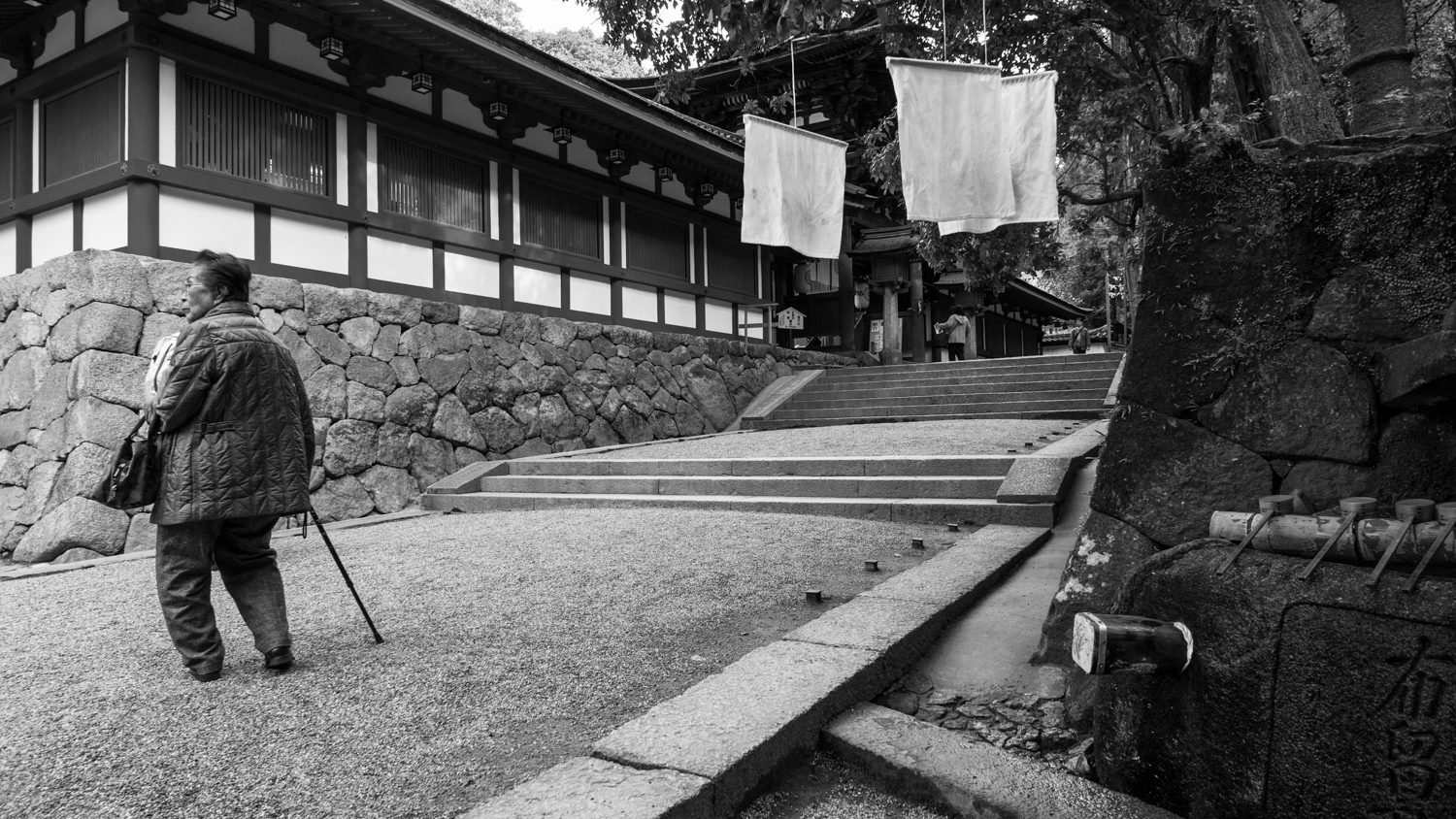 Ekkor reggel 10 óra volt. Aznap nem volt edzés, mert rajtam kívül ugye mindenki a versenyen volt, így lett egy teljsen napom amit mászkálással tölthettem. Nem para. Szerencsére Tenri híres pár dologról így volt mit néznem. Tenri egy rövid ideig még Japán fővárosa is volt. Osakától keletre dimbek dombok között fekszik. Ahogy az kell, itt is van pár szentély, templom és más vallási építmény amiknek még a nevét se tudom. Meg erdő. Sok fával. Régen jártam erdőben, és már hiányzott a csend, meg a nyugi, szóval elindultam egy túraösvényen a szentélyek felé. Se csönd, se nyugi nem volt. Legalább fa volt dögivel. Hiába volt hétköznap, mások is halloták erről a remek kis városról. Azt nem mondom hogy hömpölygött a tömeg, de nem voltunk kevesen. De azért a séta és az itt ott eldugott kis szentélyek kárpótoltak. Szerencsémre pont belefutottam valamilyen fontos eseménybe, mert nagyon sok szépen felöltözött emberke sétált velem az erdőben. Kimono meg öltöny, kis esernyők, pici apró gyerekek visítozása. Feltehetőleg imádkozni, vagy eskövőre, keresztelőre, temetésre vagy bármire mehettek. Csoportokban bevonultak a templomba ahol egy furcsán felöltözött figura egy bot végére szerkesztett papírszalagokkal hadonászott. Olyan volt mint egy portörlő csak nagyobb és szebb. Ők biztos tudták miért fizettek, én csak néztem, ahogy ami járt azt körbesöprögötte. Biztos megtisztította őket a rossz szellemektől. Ennél furcsább csak az volt amikor az autókat kezdte el söprögetni. Minden oldalról szépen tisztességesen. Kocsitisztítás combo. (azóta persze kiderítettem hogy ezt úgy hívják hogy ‘harae’ és tényleg a rossz szellemek és a balszerencse elűzésére végzik, a bot papírfecnikkel pedig ‘haraigashi’. Azóta nagy mellényel veszem tudomásul amikor ilyet látok, hogy na én ezt már tudom micsoda) A szentélyek és templomok környékén mindig van tiszta víz. Vagy természetes vagy egy betonteknőben álló. Mindegyikhez jár egy kis bambuszkanál amivel szépen ki kell merni a megfelelő mennyiségű vizet a mosdáshoz. Nem csak úgy bele a mocskos kezeket. De láttam másokat inni is. A szentély előtt van egy nagy kötél, aminek a végén van egy nagy harang, vagy csengő. Ezt pézbedobás ellenében meg lehet rángatani, majd lehet tapsolni, Szörnyen parasztnak érzem magam, de én még nem láttam eddig ilyet. Pénz, rántás, három taps, pár bólintás és tiszták vagyunk. Pikk pakk. Itt így imádkoznak. Jó volt nézni a sürgést forgást. Szép ruhában emberek harangoznak és tapsikolnak. Nem is kell több. Minden szépen rendezett, tiszta, nincs zaj, csak az alap morajlás. Elücsörögtem vagy egy órát és lőttem pár képet sunyin mintha itt se lennék. Jobb lett volna ha ott vagyok mert elég szarok lettek a képek.
