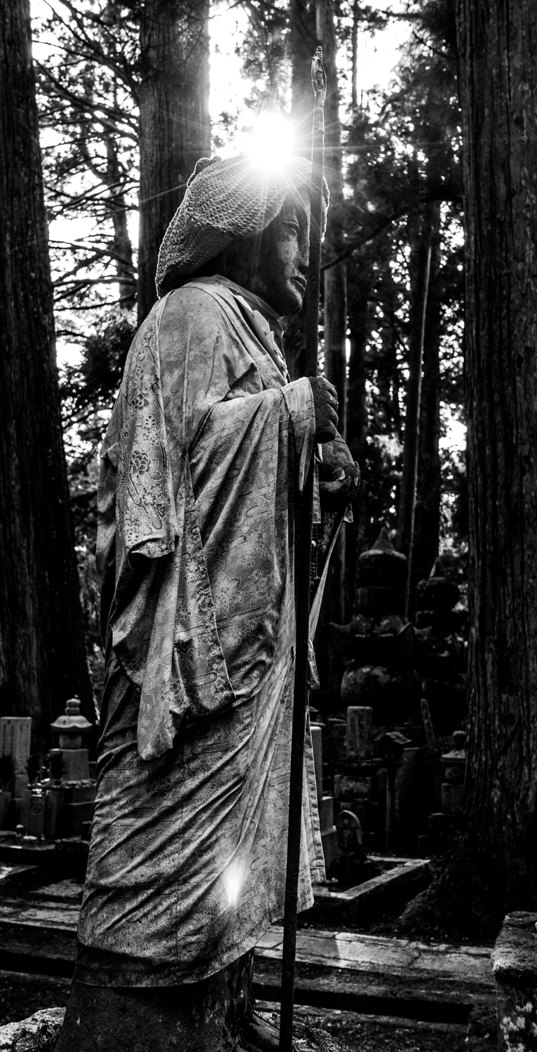Nade az erdő. Hát az megérte. A falu ugy 800 méter magasan, egy fennsíkon található, de körbe erdő és hegyek. De olyan erdő amilyenben még életemben nem jártam. A fák átlagmagassága úgy 40m, átmérőjük is megvan az 1-1.5m és korban is közelebb járnak a 600 évhez. Nem vagyok botanikus, csak tudok táblát olvasni. Ja és az erdő egyben egy temető is (Okunoin) ahol több mint 200.000 sírkő, szobor, mini szentély és a többi fekszik jobbra balra. Kis szobrok sapkákban meg köténykében, sírkövek előtt felajánlások, itt ott gyertya. Lehidaltam. Nem értettem hova keveredtem.